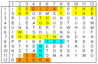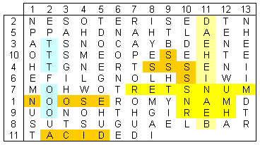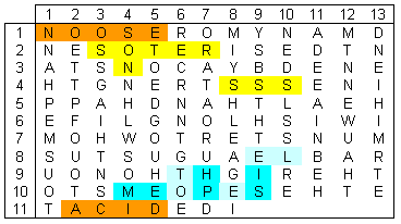This setting of 13 first revealed a couple points but not anything remarkable. The wealth/health dilemma was more apparent. Edgar Poe, the master of suspense and mystery appeared in row 2. But then I noticed the last row contained MORE SOON, complete and unencumbered; somewhat like SETTING FORTH in BJ18. I was close, but not there. The reverse spelling of NOOSE (the alternative version now slightly enhanced) and ACID persisted. What if I entered the characters into the setting in reverse order?