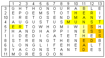 The use of an anagram for rearranging rows or columns can provide an opportunity for a selective process. Because A appears twice in BEANIE HEAD I had two options for a row to follow the one containing HER. One row produced HERMAN, which suited my case, the other would have produced HEREAL, a sequence of no consequence (perhaps).